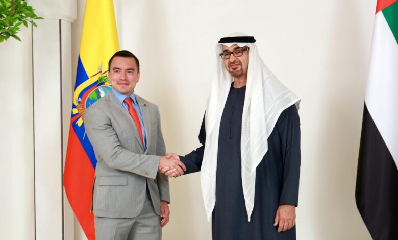 Durante su visita, el mandatario ecuatoriano, acompañado por la canciller Gabriela Sommerfeld, sostuvo una reunión de alto nivel con el presidente de los Emiratos Árabes Unidos, jeque Mohamed bin Zayed Al Nahyan.