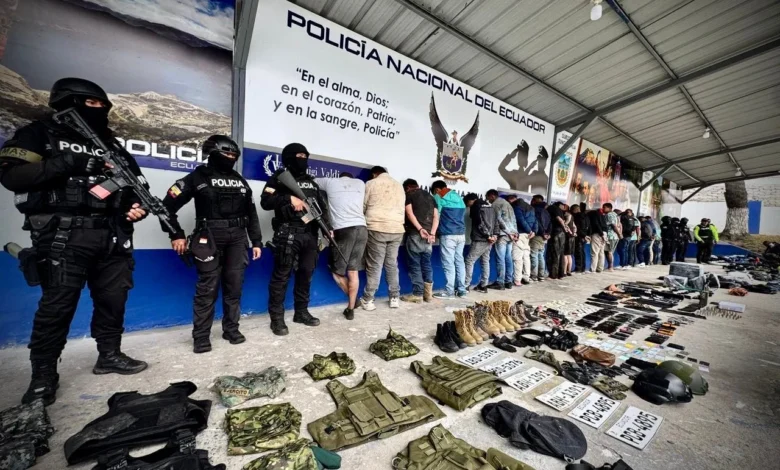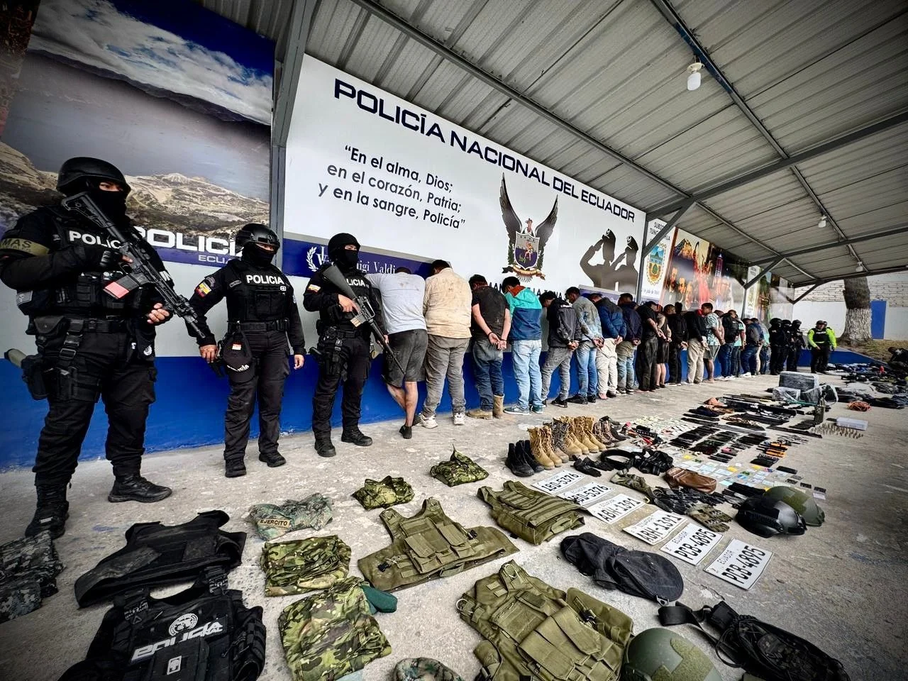 Entre los indicios levantados constan 12 armas de fuego calibre 9 milímetros, dos fusiles, municiones, inhibidores de señal, celulares y uniformes policiales y militares.