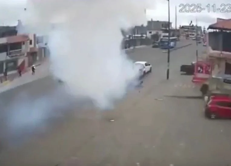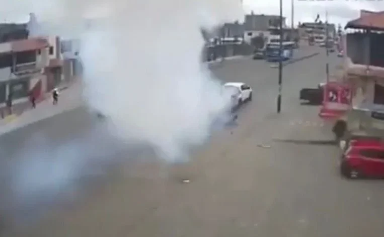 Unidades de la Policía Nacional y equipos del Cuerpo de Bomberos de Pelileo acudieron al sitio del suceso. Cámaras de seguridad del sector captaron el momento exacto de la detonación.