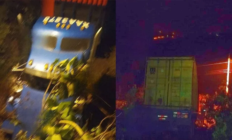 Un tráiler perdió pista en la carretera principal, se descarriló y terminó en una ladera, quedando a punto de caer a una vía secundaria.