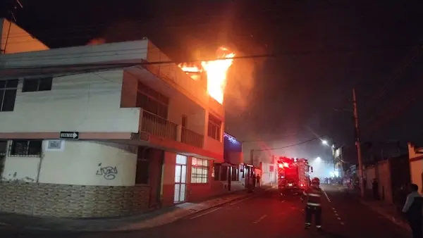 Bomberos atienden incendio estructural en Riobamba la noche del martes en una vivienda ubicada en la intersección de las calles Almagro y Villarroel, en el centro de la ciudad.