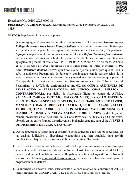 La Presidencia de la Corte Provincial de Justicia de Chimborazo incorporó todos los escritos y solicitudes presentados por las partes y estableció como fecha oficial el jueves 4 de diciembre de 2025, a las 09h30, en el auditorio institucional ubicado en la intersección de las calles Primera Constituyente y Pichincha.
