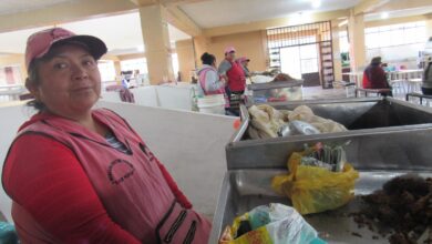 A las 11:45 h Carmen Quishpe sigue con el mote y el chicharrón en su puesto de venta situado en…