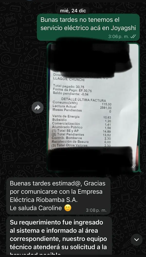 Narváez indicó que los moradores han presentado múltiples reclamos ante la Empresa Eléctrica Riobamba S.A., tanto por vía telefónica como de forma presencial en las oficinas del cantón Chunchi.
