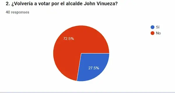 El 72,5% de los consultados señaló que no volvería a votar por el alcalde John Vinueza, frente a un 27,5% que sí lo haría.