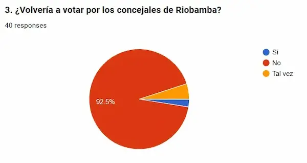 Sin embargo, el rechazo hacia los concejales es aún más marcado: el 92,5% afirmó que no volvería a votar por los concejales de Riobamba, mientras que apenas un 2,5% expresó intención de respaldarlos nuevamente.