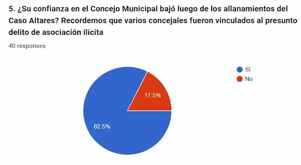 El impacto del Caso Altares se refleja con fuerza en la percepción ciudadana. El 82,5% de los encuestados afirmó que su confianza en el Concejo Municipal de Riobamba disminuyó tras los allanamientos y la vinculación de varios concejales al presunto delito de asociación ilícita. S