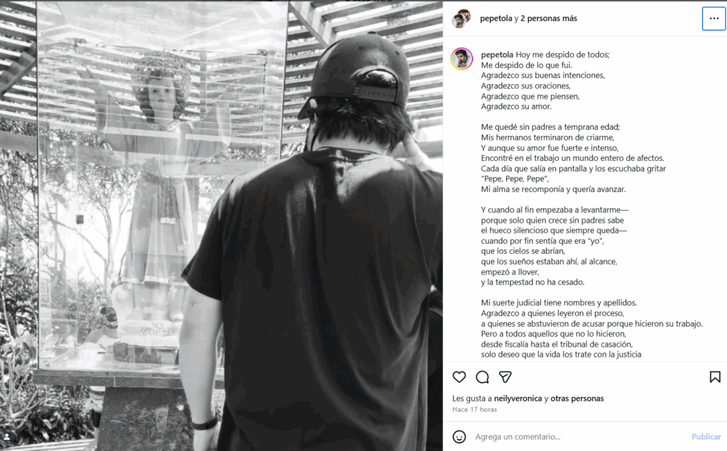 Tras el anuncio de la ratificación de la condena, Pepe Tola reazlizó una publicación en sus redes sociales, dónde se despidió de su antiguo «yo».