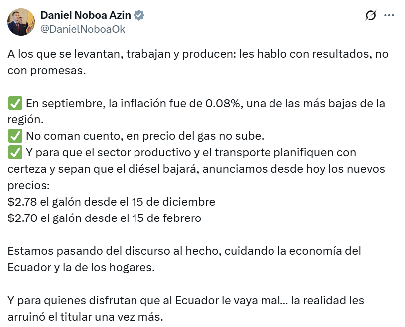 “Queremos que quienes trabajan y producen planifiquen con certeza. Hablamos con resultados, no con promesas”, expresó Noboa en su cuenta oficial de X.