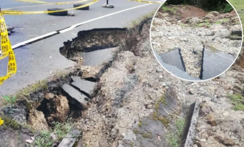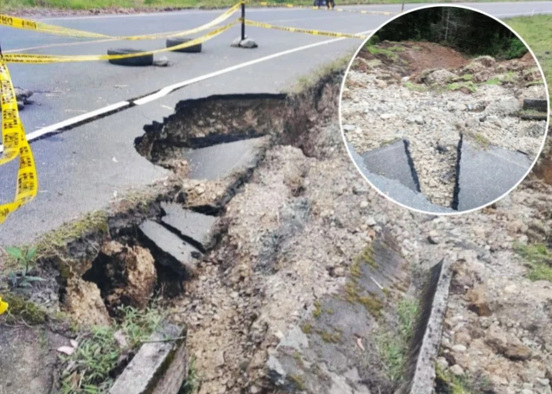 Generando un riesgo constante para quienes transitan por esta zona. La afectación compromete parte de la estructura vial, evidenciando la fragilidad del terreno en este punto.