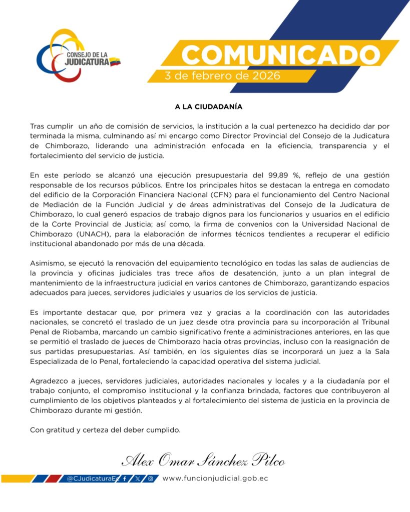 En la mañana de este martes 3 de febrero de 2026, el Pleno del Consejo de la Judicatura analizó y aceptó la renuncia de Alex Omar Sánchez Pilco a su cargo como Director Provincial del Consejo de la Judicatura de Chimborazo, durante una sesión extraordinaria.