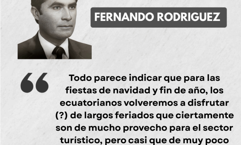 Todo parece indicar que para las fiestas de navidad y fin de año, los ecuatorianos volveremos a disfrutar (?) de largos feriados que ciertamente son de mucho provecho para el sector turístico, pero casi que de muy poco beneficio para el resto de la población. El feriado que surgió luego del desastroso paro navideño , bajo la tutela de CONAIE y FUT, tuvo , según señalaron las autoridades gubernamentales, un movimiento cercano a los 50 millones de dólares, suma nada despreciable después de las enormes pérdidas del paro.