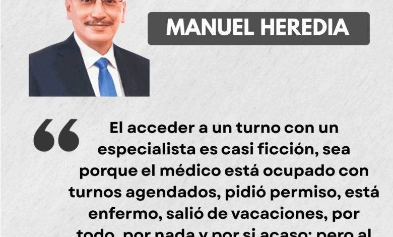 El acceder a un turno con un especialista es casi ficción, sea porque el médico está ocupado con turnos agendados, pidió permiso, está enfermo, salió de vacaciones, por todo, por nada y por si acaso; pero al final la dificultad es tan grande, que el paciente definitivamente no logra obtener este derecho fundamental que el Estado está obligado a dar a los ciudadanos. Si se trata de obtener medicinas, es otro cuento, si recibió parcialmente algo este mes, el próximo ya no existe, o lo más usual, no hay nada de lo que el médico prescribió.
