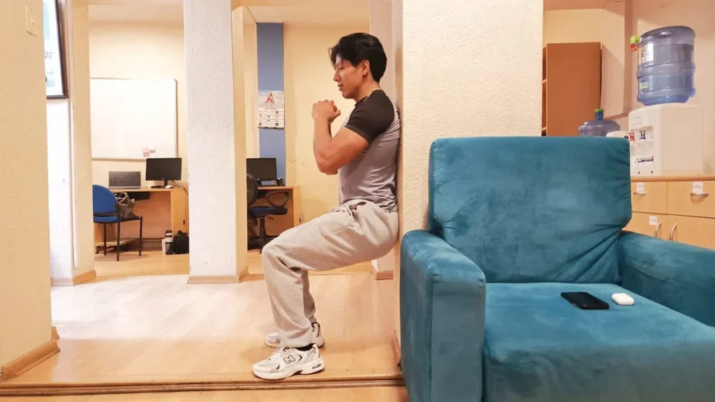 Apoya la espalda en la pared o mantén posición libre. Dobla rodillas a 90°, abdomen activado y espalda recta. Respira profundo y controla la tensión.