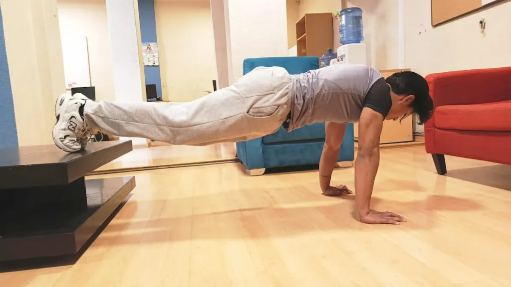 ¿Puedo hacerlo en casa? Sí, solo necesitas un espacio seguro y una superficie elevada para los Decline Push-ups.