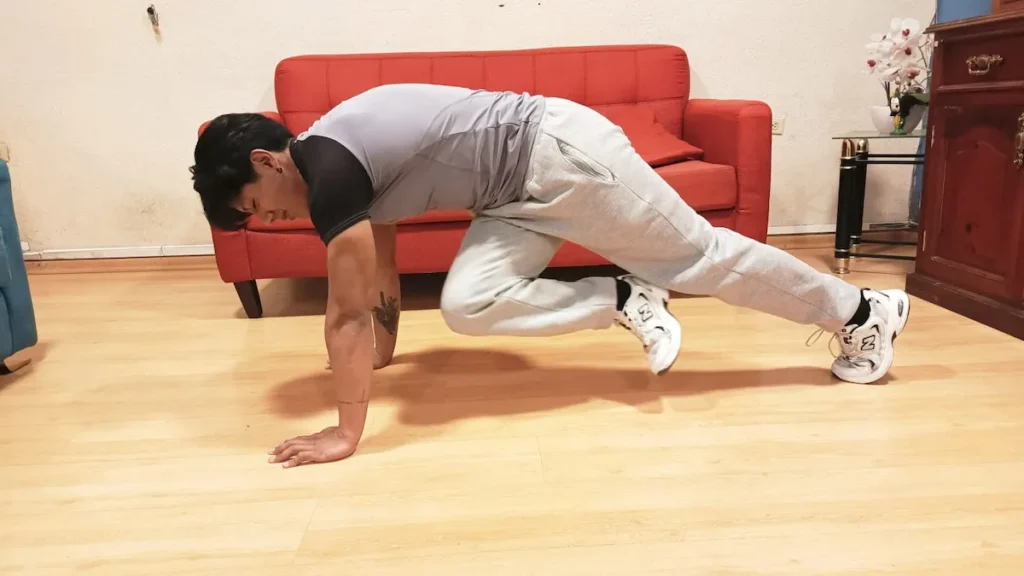 Inicia en plancha alta, haz una flexión completa. Al subir, lleva una rodilla hacia el codo contrario. Alterna con la otra pierna. Una flexión más el movimiento cruzado cuenta como una repetición.
