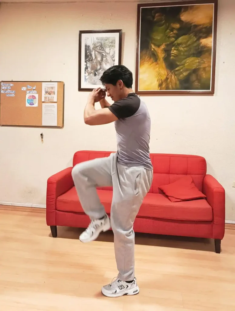 Pies al ancho de hombros, baja en sentadilla hasta 90°. Al subir, lleva la rodilla al pecho contrario, cruzando el cuerpo. Alterna piernas.