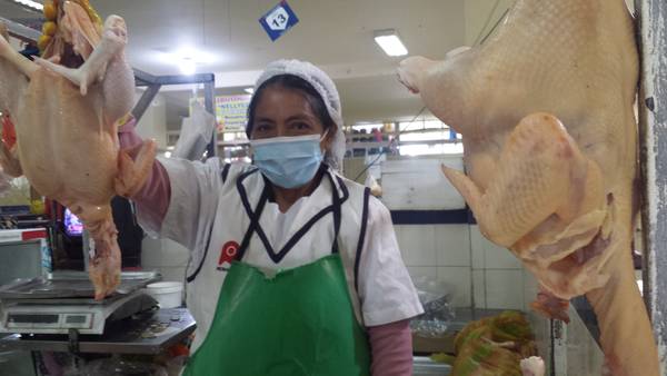 Bioseguridad. Además de seguir cursos y talleres sobre un manejo adecuado de los alimentos, aprendió y se acostumbró -al igual que todos- a utilizar mascarilla, alcohol y cumplir con las medidas de bioseguridad. Una vez faenados los pollos, toma su mascarilla, el alcohol y se traslada a su puesto en el mercado, en donde empiezan las ventas desde las 07:00 h hasta las 17:00 h todos los días.
