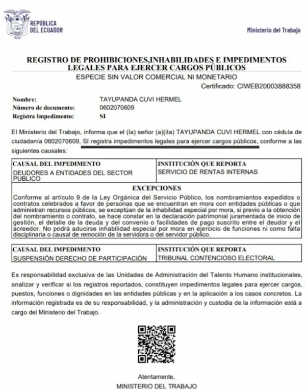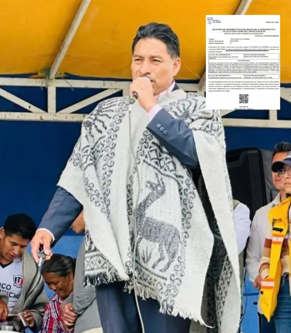 Ministerio de Trabajo registró el impedimento para ejercer cargos públicos del prefecto de Chimborazo Hermel Tayupanda tras orden del TCE.