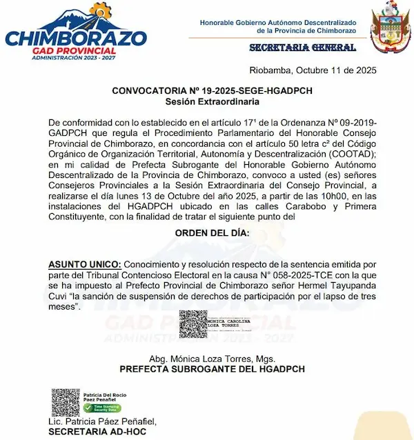 Con esta convocatoria, Loza busca garantizar la operatividad institucional del GAD Provincial y dar cumplimiento a los dictámenes judiciales que establecen la sustitución temporal de funciones dentro de la Prefectura de Chimborazo.
