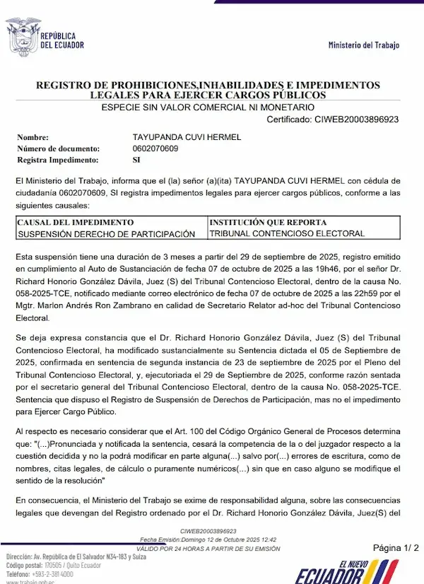De manera paralela, el Ministerio del Trabajo emitió el certificado CIWEB20003896923 el 12 de octubre de 2025, confirmando que Hermel Tayupanda Cuvi registra impedimentos legales para ejercer cargos públicos. El documento indica que la sanción obedece a la “suspensión del derecho de participación” impuesta por el TCE, con una duración de tres meses contados desde el 29 de septiembre de 2025.