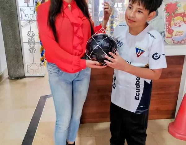 Ing. Diego Remache, padrino del Mundialito, entregó el balón de Kendry Páez a su ahijado como símbolo de acompañamiento e impulso.
