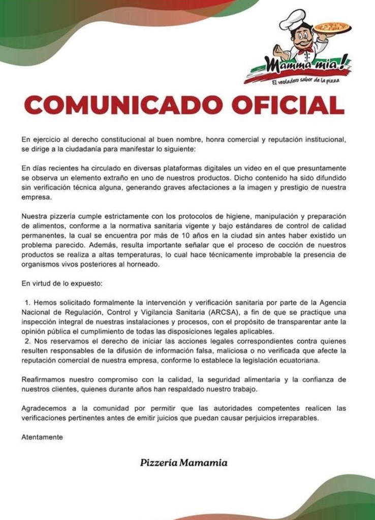 Comunicado oficial de la pizzería en Riobamba