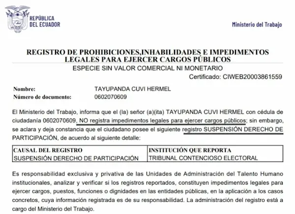 El certificado incluyó además un párrafo clave: “Es responsabilidad exclusiva y privativa de las Unidades de Administración del Talento Humano institucionales analizar y verificar si los registros reportados constituyen impedimentos legales para ejercer cargos, puestos, funciones o dignidades en las entidades públicas (…)”.