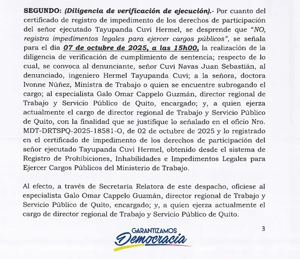Por esta razón, el TCE llama a una audiencia el 07 de octubre del 2025 a las 15:00 para revisar el cumplimiento de su sentencia.