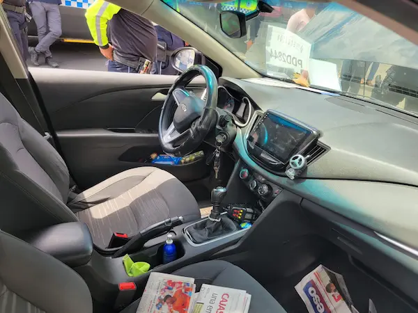 Allí, efectivamente, un automóvil Chevrolet Cavalier, color negro y sin placas, yacía sobre la vereda en plena esquina, con la llanta del conductor baja, sin ningún ocupante en su interior.